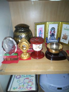 お位牌は御聖堂左側に設置してある仏陀釈尊の横に祀っています。湾唆(わんさ)は菩薩様になったと信じます。そして愛する可愛い、唆絆(さき)のことを守ってくれるでしょう。更には生きとし生けるもののいのちを守ってくれるでしょう。